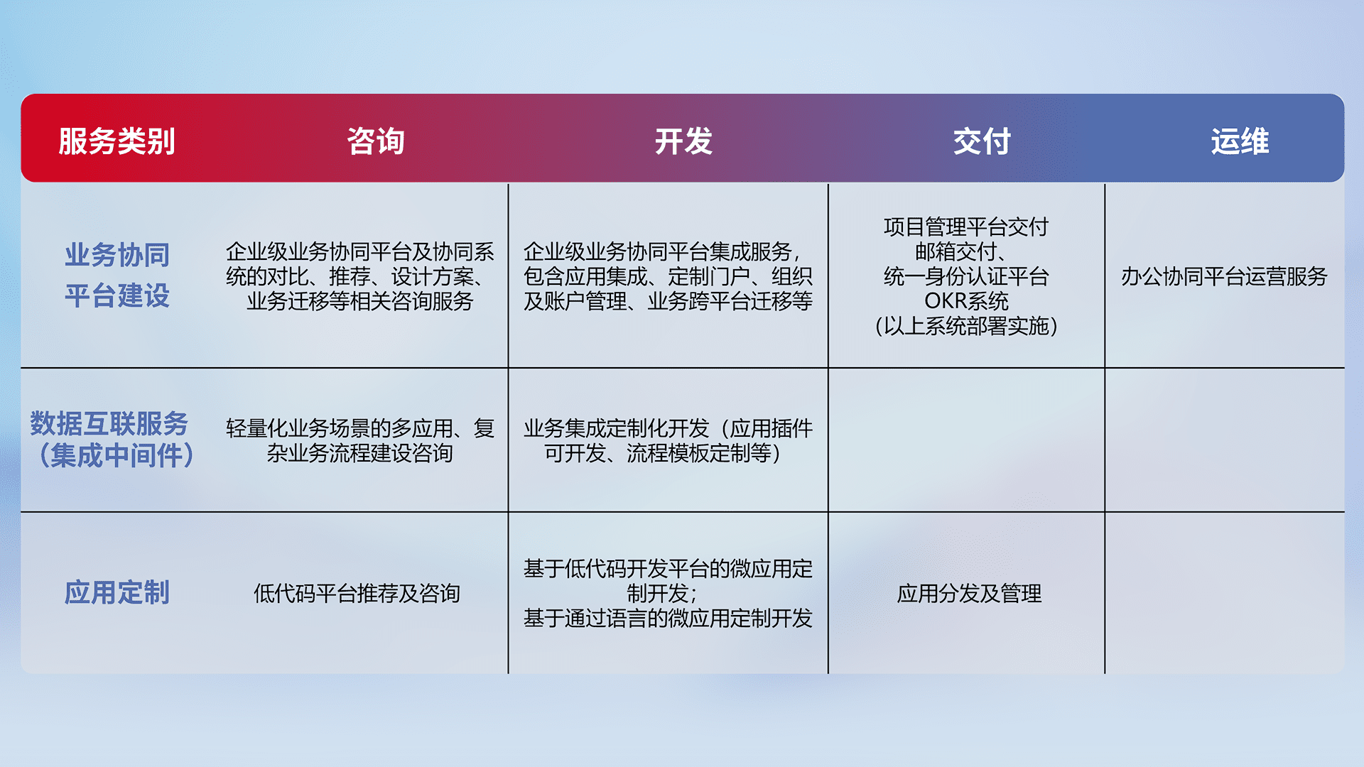 针对钉钉、、、企微、、IDaas等平台级产品提供产品的规划、、、、方案、、交付、、定制化开发等服务,,,,实现如统一协同办公、、、、智能客户服务、、、混合会议管理、、智能数据查询、、、等业务场景,,实现数字化转型。。。。