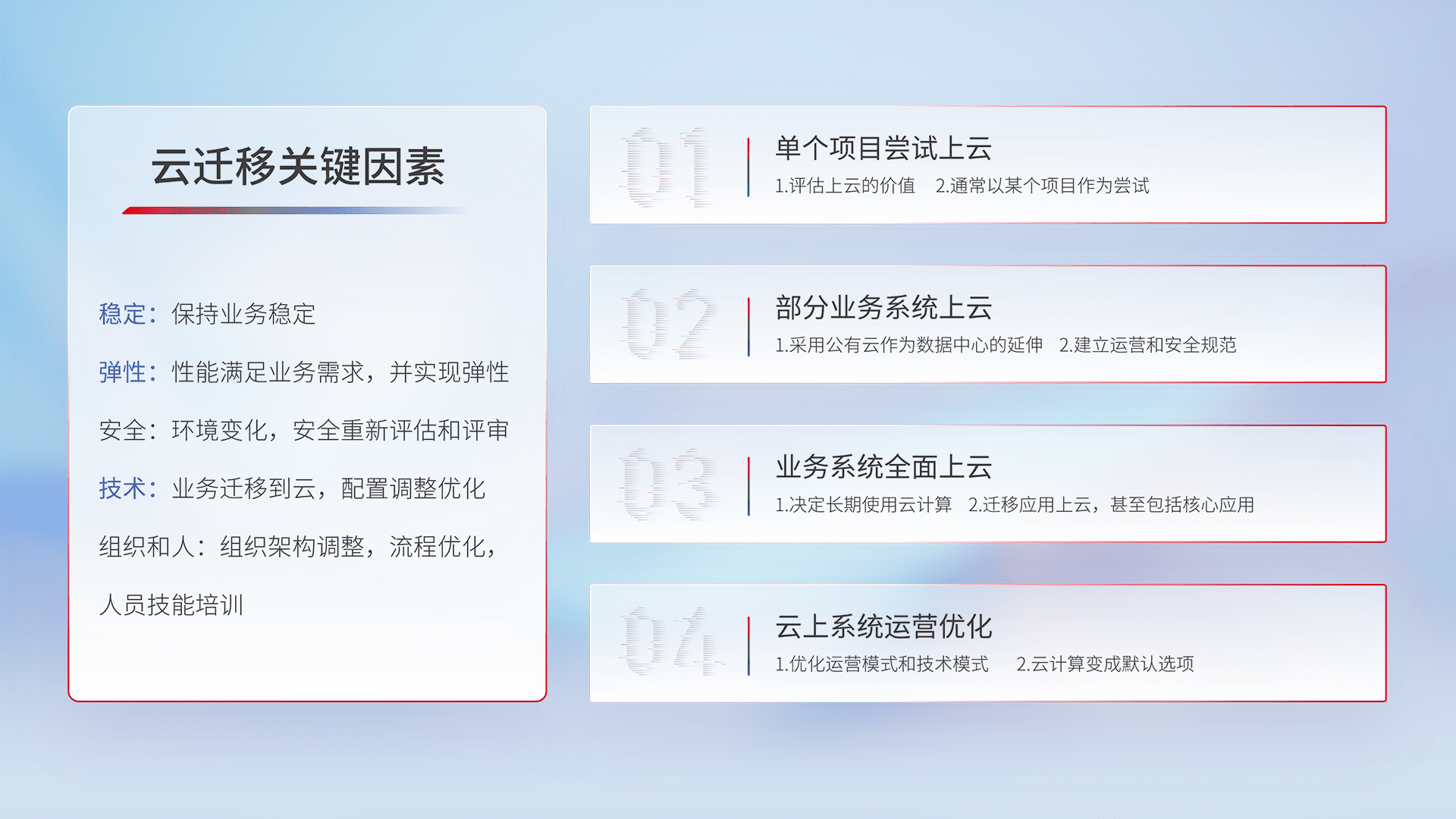 结合实际业务,,,,从规划设计、、云平台选型、、、、云原生改造、、、、数据迁移、、、集成交付,,迁移全过程为客户识别最佳上云路径,,做好风险识别管理,,设计网络架构、、、、身份权限、、、安全审计合规、、、操作审计、、、日志审计、、监控告警策略、、、、多站点容灾设计等,,,,对云上基础设施进行整体规划,,提升IT治理水平,,,以满足弹性、、高可用、、、、高性能的需求。。。